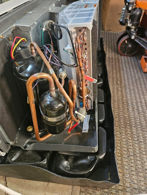 Scratch and Dent Amana J-Series PTAC Model 15,000 BTU PTAC Unit with 3.5 kW Electric Heat- Model PTC153J35AXXX- 2308005080 was cosmetically damaged during shipping. This unit is PARTS ONLY UNIT Damage Description: Front Panel – The left edge on the cover is cracked from the top to the middle. Right Panel – The pan tray to bent from the middle to the back of the unit. The back of unit-The coil has numerous bent fins. One large area right in the middle with a dent. The coil box is bent towards the front of the unit. “All scratch and dent equipment is new that was damaged either in shipping or while being handled in our warehouse. Everything comes with a full factory warranty.